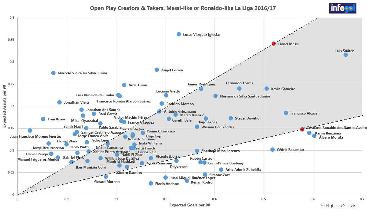 Here's the xG/90 and xA/90 for the 70 largest cumulative, goal involvement achievers from La Liga's 2016/17 season.